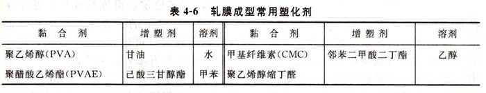 軋膜成型(sheet forming)也屬于可塑法成型。將準備好的坯料拌以一定量的有機塑化劑,使之具有可塑性。塑化劑是由黏合劑、增塑劑、溶劑、消泡劑等配制而成。黏合劑要求有足夠的黏合力、較好的成膜性能(良好的延展性和韌性),并具有燒后灰分少、無毒性的特點。增塑劑所起的作用是插入高分子化合物的鏈段之間,減弱相互之間吸引力,使黏合劑受力變形后不致出現彈性收縮和破裂,從而提高坯料的可塑性。溶劑的主要作用是溶解黏合劑和增塑劑。軋膜成型常用的黏合劑、增塑劑和溶劑列于表4-6中。