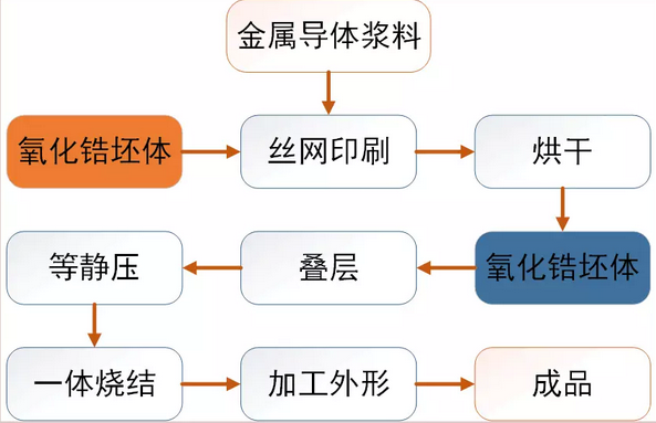 導(dǎo)電漿料可由8-20份金粉、30-60份鎳粉、20-30份鎢粉及8-20份硼硅玻璃粉組成(份數(shù)按重量計(jì))。氧化鋯坯體采用干壓成型或者流延成型工藝制備。
